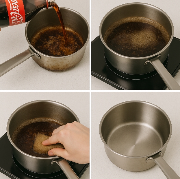 냄비 탄 자국에 콜라를 부어놓으면 의외로 쉽게 지워집니다. 콜라 속 탄산과 인산 성분이 금속을 부식시키는 작용을 하기 때문입니다.