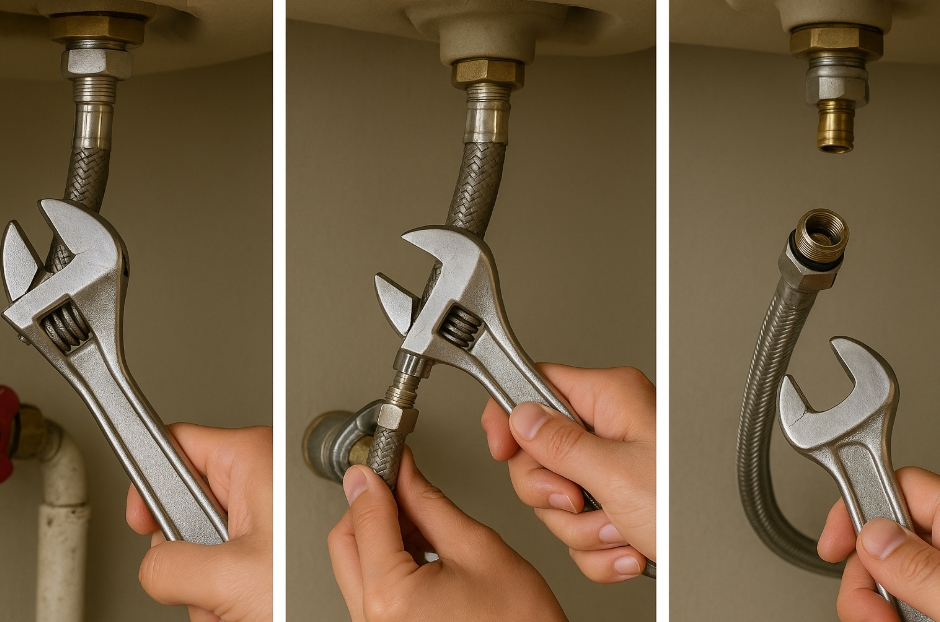 - 스패너나 렌치를 이용해 냉·온수 호스를 하나씩 풀어주세요.