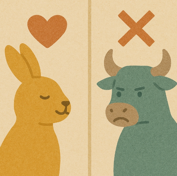 양띠와 토끼띠는 서로의 감성을 잘 이해해주는 궁합입니다. 둘 다 조용하고 평화로운 성격을 지녔기 때문에 갈등 없이 자연스럽게 관계를 이어나갈 수 있죠. 정서적 교감이 깊어지고, 서로를 치유해주는 조합으로 평가받습니다.