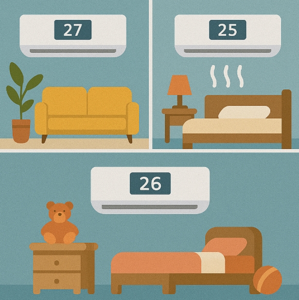- 거실 : 26~27도 유지, 활동량 많고 넓은 공간이므로 너무 낮추지 않도록