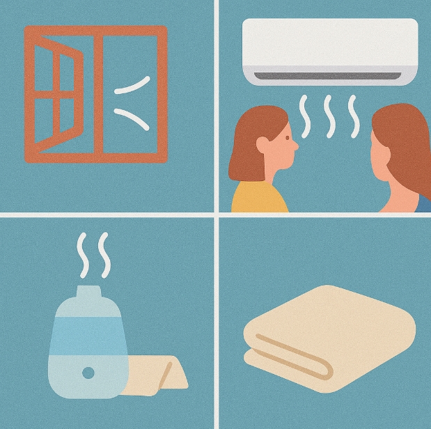- 실내 가습기나 젖은 수건으로 건조함 방지