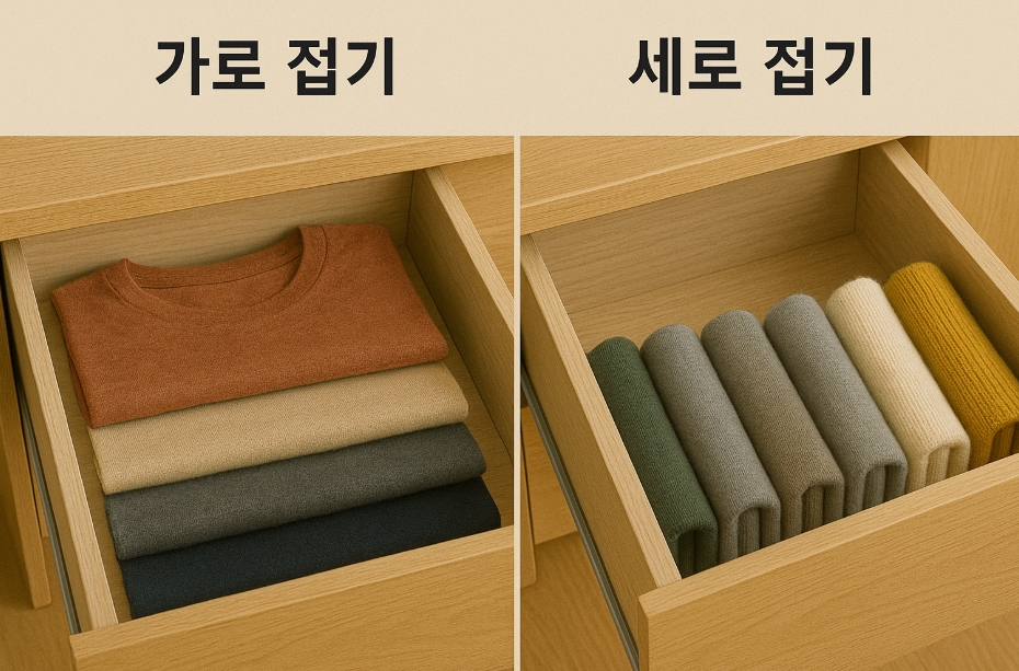 서랍에 옷을 보관할 때는 세로 접기 방식이 효율적입니다.