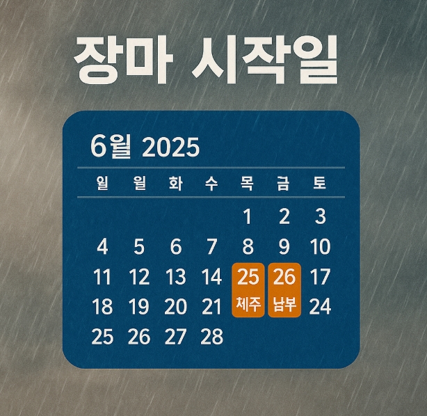 장마 시작일(제주 6/19, 남부 6/23, 중부 6/25)을 기준으로 계획을 세우고, 집중호우와 폭염까지 염두에 두는 것이 2025년 여름의 핵심 전략입니다.