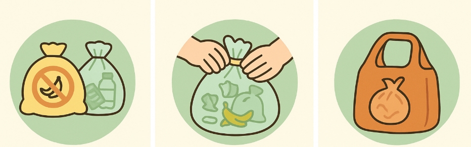 → 음식물을 일반봉투에 버리거나, 재활용품을 음식물 봉투에 넣으면 과태료 대상이 될 수 있습니다. - 봉투가 꽉 차지 않더라도 묶어서 배출