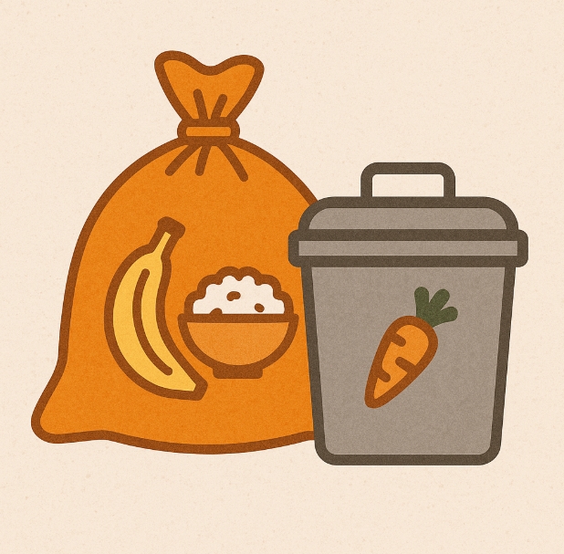 대부분의 지자체는 오렌지색 또는 노란색 계열의 전용 봉투를 사용하고, 음식물 쓰레기 전용 수거함이 따로 마련되어 있습니다.