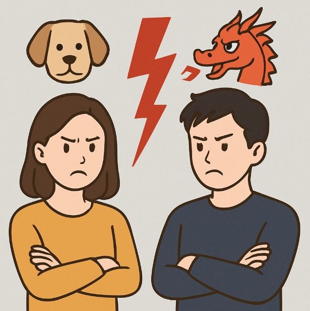 용띠는 강한 자존심과 추진력이 있지만, 개띠와는 가치관 충돌이 자주 일어날 수 있습니다. 특히 주도권 싸움이나 감정 충돌이 우려되는 조합입니다.