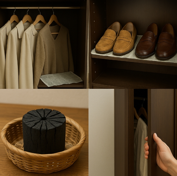 - 숯: 다공성 구조로 습기 제거 + 냄새 제거까지 동시에 가능