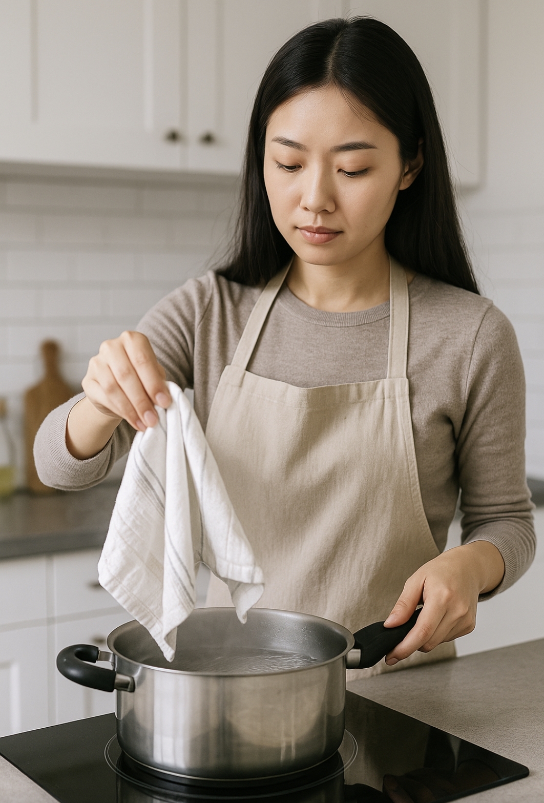 행주는 음식물, 기름기, 각종 세균에 노출되기 쉽습니다. 일반 세탁만으로는 대장균, 황색포도상구균 같은 유해균이 남을 수 있습니다. 끓는 물로 삶아주면 고온으로 살균 효과를 얻을 수 있어 위생 관리에 탁월합니다.